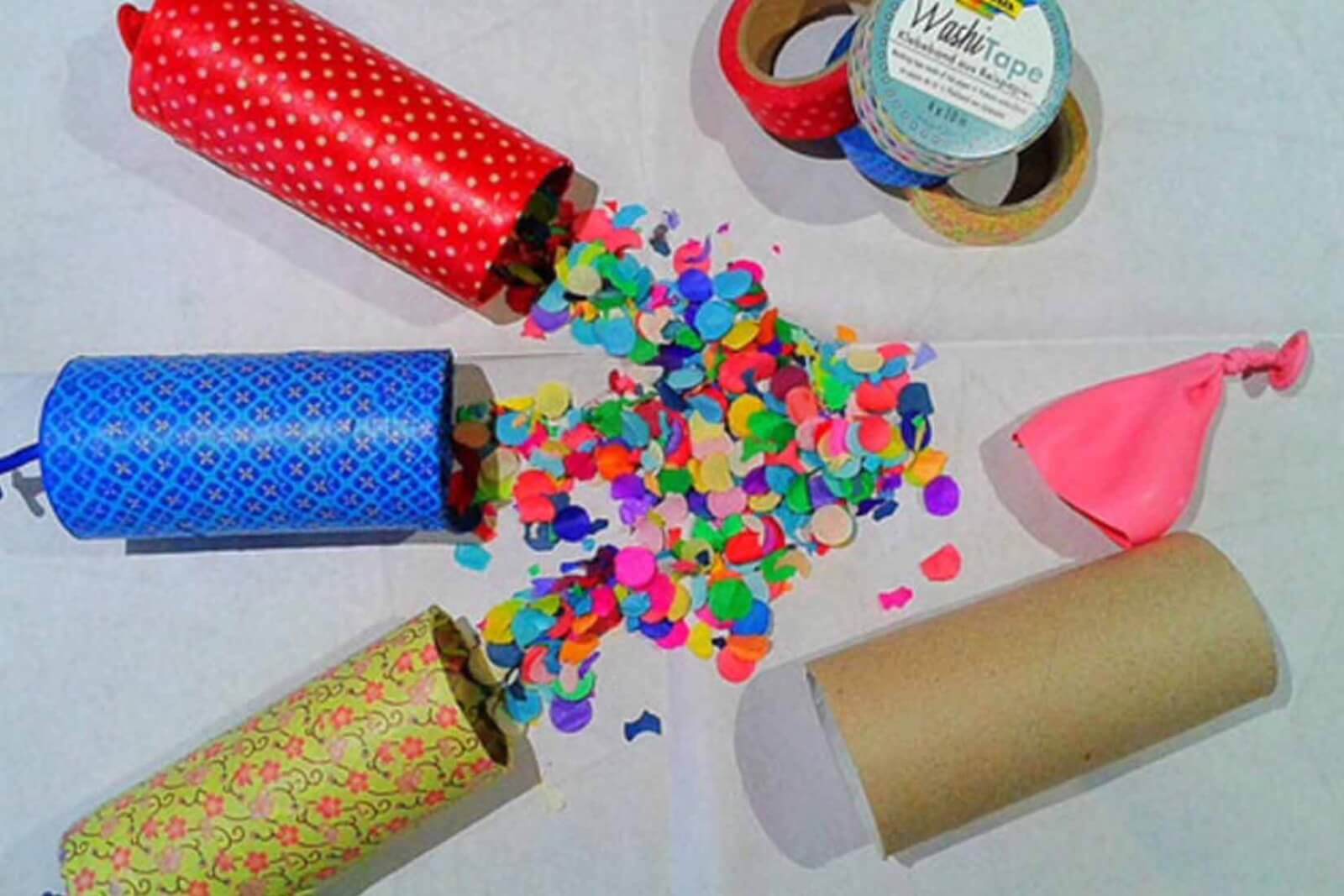 Einfach Konfetti in die Klopapierrolle füllen und am Zipfel des Luftballons ziehen. Beim loslassen des Luftballons wird das Konfetti automatisch aus der Rolle gefeuert. Viel Spaß damit.